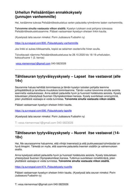 vesa.niemenmaa1@gmail.com 040-5823026 ----------------------------------------------------------------------------------------------------------------- Tähtiseuran tyytyväisyyskysely – Lapset itse vastaavat (alle 14v) Seuramme haluaa kehittää toimintaansa ja tämän kyselyn tulosten pohjalta teemme johtopäätöksiä ja tarvittavia muutoksia toimintaamme. Tämän vuoksi toivomme sinulta avointa asennetta vastauksissasi. Anna aidosti palautetta hyvin ja huonosti hoidetuista asioista. Kysely toteutetaan yhteistyössä Suomen Olympiakomitean kanssa. Kysely suoritetaan anonyyminä, joten yksittäisiä vastaajia ei voida tunnistaa. Toivomme sinulta vastausta viikon sisällä. Pääset vastaamaan kyselyyn oheisen linkin kautta. https://q.surveypal.com/506.-Palautekysely-lapsille (Kyselyssä laita seuran nimeksi: Porin Judoseura Fudoshin ry) T: vesa.niemenmaa1@gmail.com 040-5823026 ----------------------------------------------------------------------------------------------------------------- Hei, Me seurassamme haluamme, että viihdyt treeneissä ja että joukkueessasi/ryhmässäsi on hyvä ilmapiiri. Tärkeää on myös, että saamme palautetta treenien sisällön ja valmennuksen osalta. Anna kyselyssä aidosti palautetta hyvin ja huonosti hoidetuista asioista. Kysely toteutetaan yhteistyössä Suomen Olympiakomitean kanssa. Tutkimus suoritetaan nimettömänä, joten yksittäisiä vastaajia ei voida tunnistaa. Toivomme sinulta vastausta viikon sisällä. https://q.surveypal.com/474.-Palautekysely-nuorille Pääset vastaamaan kyselyyn oheisen linkin kautta. (Kyselyssä laita seuran nimeksi: Porin Judoseura Fudoshin ry) T: vesa.niemenmaa1@gmail.com 040-5823026 Hei, Me seurassamme haluamme, että viihdyt treeneissä ja että joukkueessasi/ryhmässäsi on hyvä ilmapiiri. Tärkeää on myös, että saamme palautetta treenien sisällön ja valmennuksen osalta. Anna kyselyssä aidosti palautetta hyvin ja huonosti hoidetuista asioista. Kysely toteutetaan yhteistyössä Suomen Olympiakomitean kanssa. Tutkimus suoritetaan nimettömänä, joten yksittäisiä vastaajia ei voida tunnistaa. Toivomme sinulta vastausta viikon sisällä. https://q.surveypal.com/257.-Palautekysely-aikuisliikkujille Pääset vastaamaan kyselyyn oheisen linkin kautta. (Kyselyssä laita seuran nimeksi: Porin Judoseura Fudoshin ry) T: vesa.niemenmaa1@gmail.com 040-5823026 ----------------------------------------------------------------------------------------------------------------------