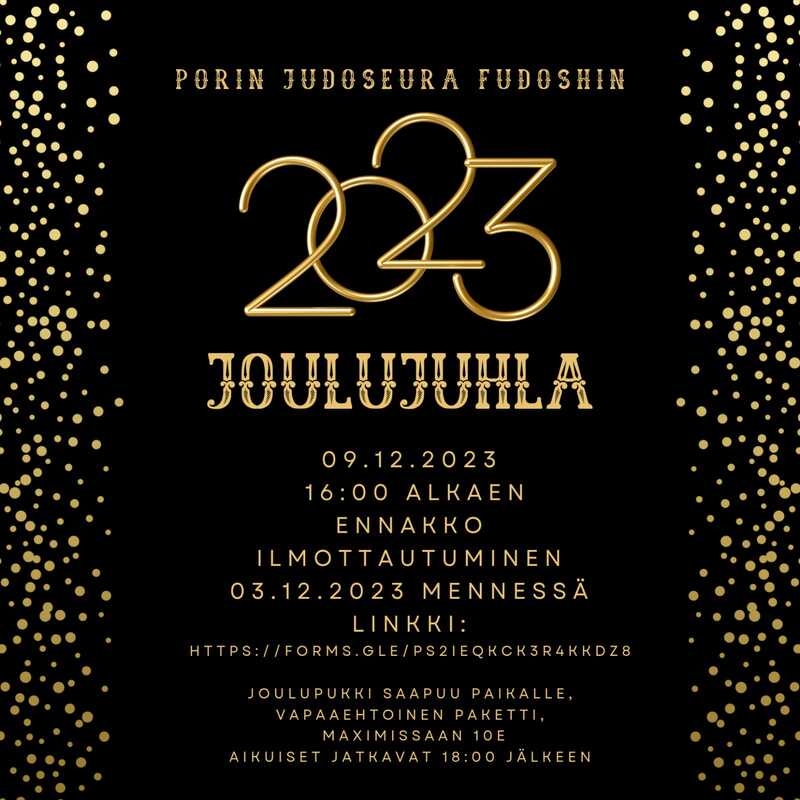 Ilmoittatumislinkki Ennakko ilmoittautuminen 03.12.2023 mennessä. - Joulupukki saapuu paikalle - vahaaehtoinen paketti max 10 euroa - aikuiset jatkavat klo 18:00 jälkeen Osoite on vähän piilossa tuolla ilmo linkissä mutta siis juhlat pidetään: Hyvelän Maja Urheilumajantie 32, 28200 Pori